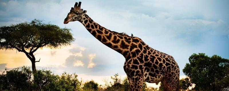 长颈鹿是一种生长在非洲的反刍偶蹄动物,拉丁文名字的意思是长着豹纹的骆驼。它们是世界上现存最高的陆生动物。站立时由头至脚可达6-8米,体重约700千克,刚出生的幼仔就有1.5米高;皮毛颜色花纹有斑点和网纹型,头的额部宽,吻部较尖,耳大竖立,头顶有1对骨质短角,角外包覆皮肤和茸毛;颈特别长(约2米),颈背有1行鬃毛;体较短;四肢高而强健,前肢略长于后肢,蹄阔大;尾短小,尾端为黑色簇毛。牙齿为原始的低冠齿,不能以草为主食,只能以树叶为主食;舌较长,可以用于取食;具短角,角上被有毛的皮肤覆盖。
